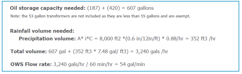 Example: Substation A has one transformer with 187 gallons of mineral oil capacity, one transformer with 420 gallons of mineral oil capacity, and four transformers with 53 gallons of mineral oil capacity each. The area is not diked, as standing water at a facility where high voltage is present is a potential safety hazard. The peak rainfall intensity of 0.6 inch per hour (i) has been determined reasonable design criterion for the area. The drainage area is 8,000 sq. ft.(A) with 100% imperviousness with a run off coefficient of 0.88 (C).