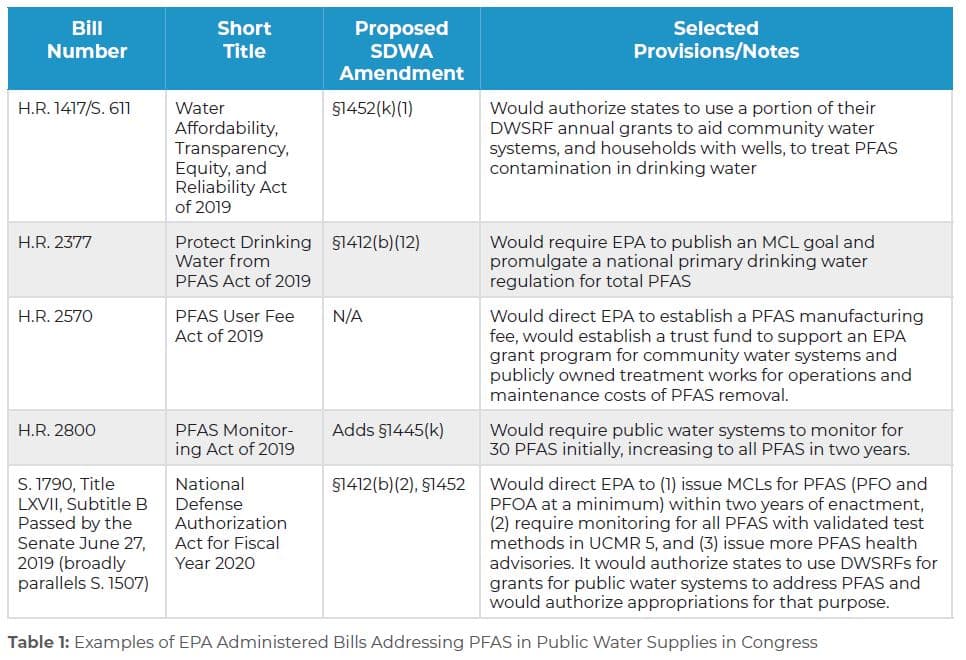 The 116th Congress has introduced more than 35 bills to address PFAS. Multiple bills, including the House and Senate passed National Defense Authorization Act (NDAA) bills (H.R. 2500 and S. 1790), would direct the EPA to take regulatory and other actions to address these emerging contaminants under several environmental statutes. Several SDWA-related bills would direct the EPA to establish a drinking water standard for one or more PFAS, require monitoring for PFAS in public water supplies, and authorize grants to communities to treat PFAS in drinking water. Examples of these bills are highlighted in Table 1 below.