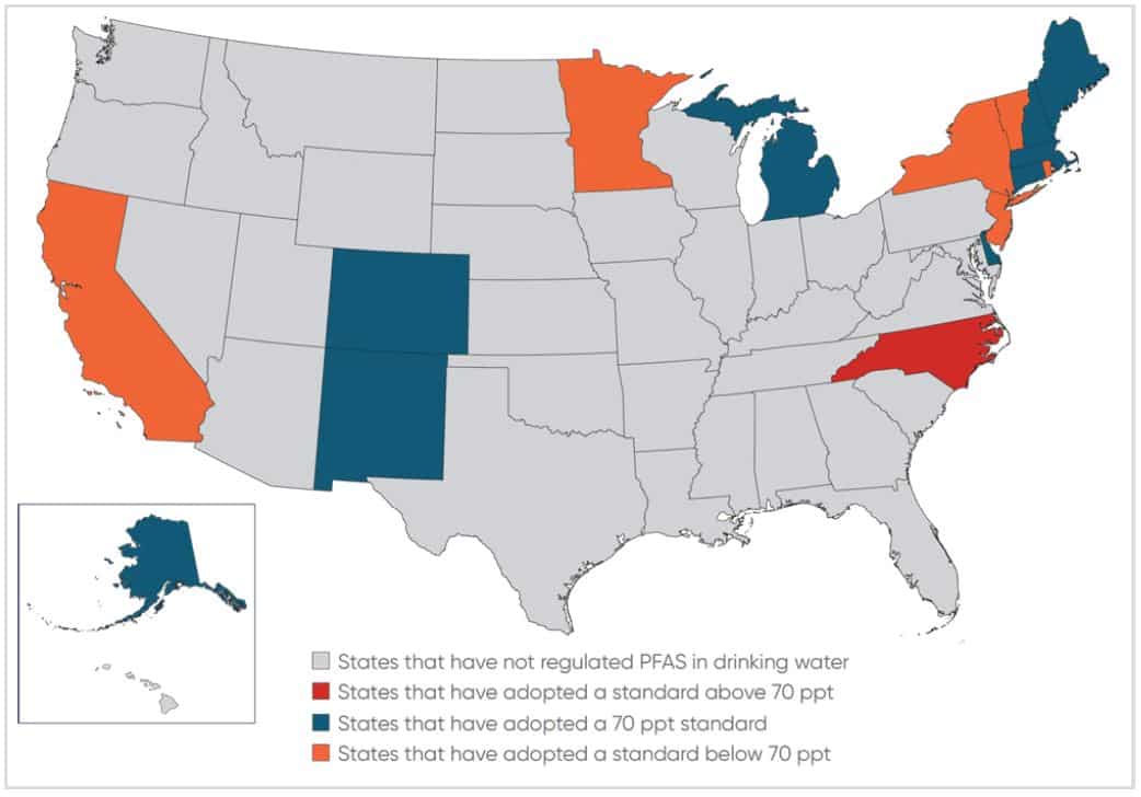 Although the EPA issued its PFAS Action Plan in February 2019, many states have taken their own measures against PFAS pollutants. As a result, states have adopted a patchwork of regulations and standards. Currently, there are 16 states that have formal policies addressing PFAS (see Figure 1), and at least seven states have policies or have indicated they are pursuing policies stricter than EPA’s current health advisory of 70 ppt for PFOA and PFOS.