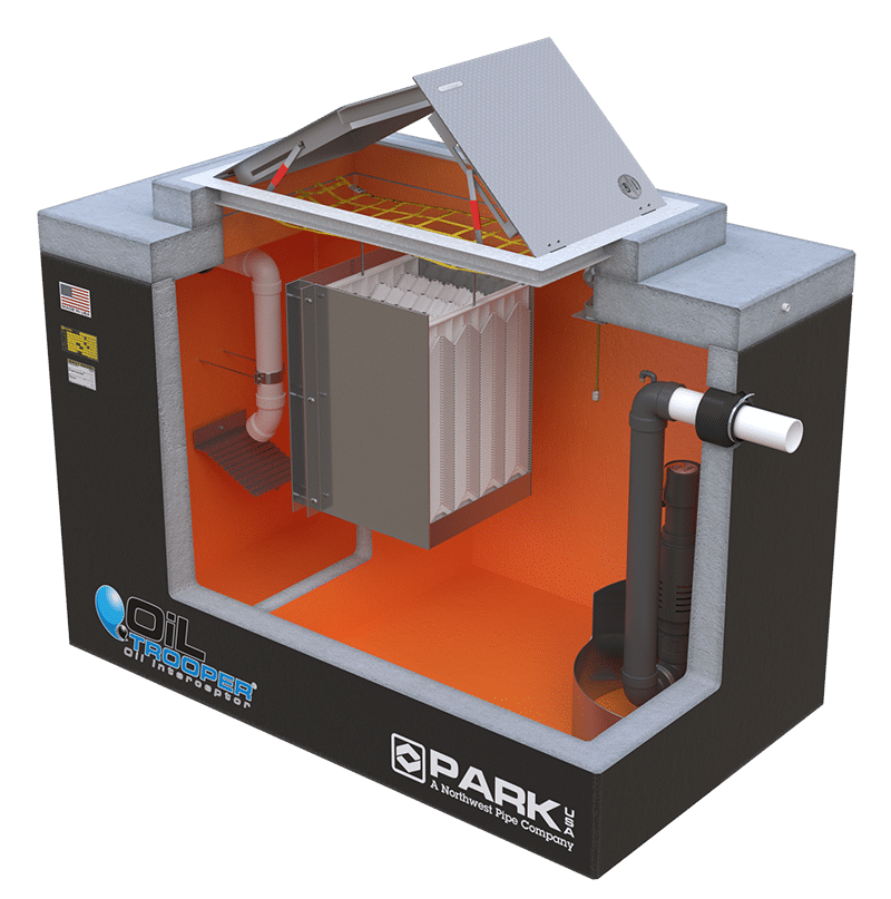 The ParkUSA® OilTrooper® is a sand-oil interceptor that consists of a multi-compartment basin and patented enhanced separation technology for sediment and oil separation. Typical applications include vehicle maintenance and washrack facilities, fueling depots, industrial areas, parking lots, and stormwater runoff.