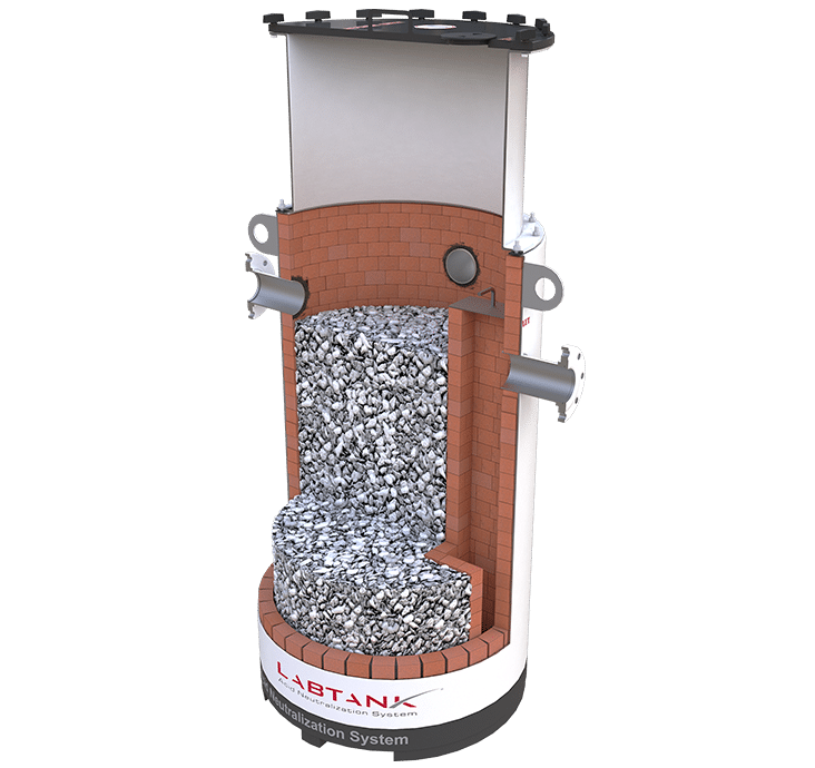 Acidic wastewater flows into the neutralization tank or basin, is neutralized with an agent such as sodium hydroxide or calcium carbonate rock media, then leaves the tank to discharge into sewer system in compliance with local, state, or federal regulations.