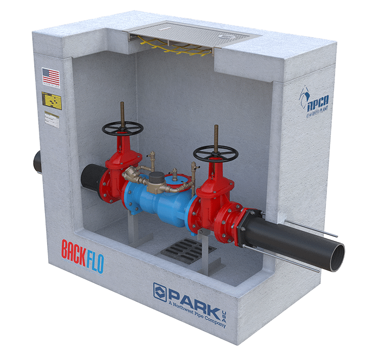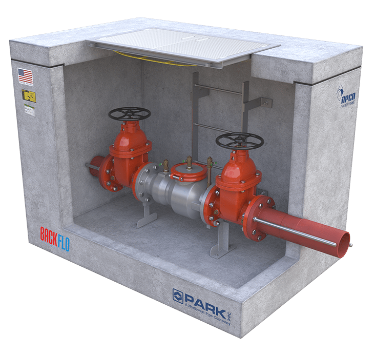 Backflow prevention assemblies stop the undesirable reversal flow of water or other liquids, gases, or substances into potable water distribution pipes. The assemblies ensure that water flows in only one direction and protects potable water systems from contamination or pollution due to backflow. Each NWPX Park BackFlo® backflow prevention assembly includes a complete cross-connection control solution for all municipal, residential, commercial, and industrial projects. The assemblies are delivered onsite and ready to plumb.