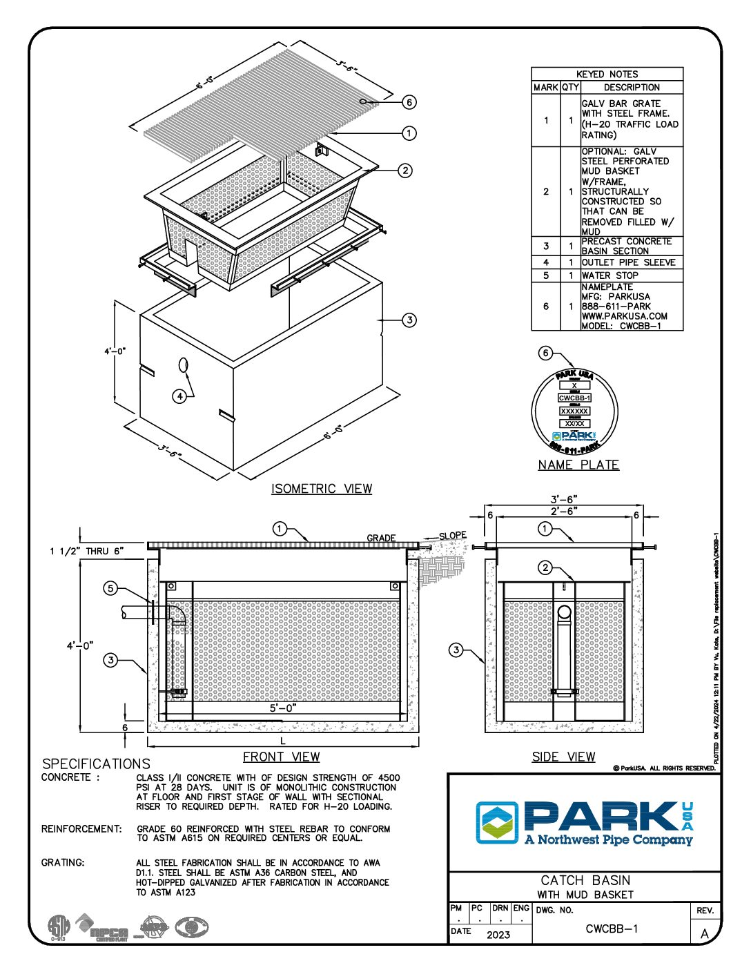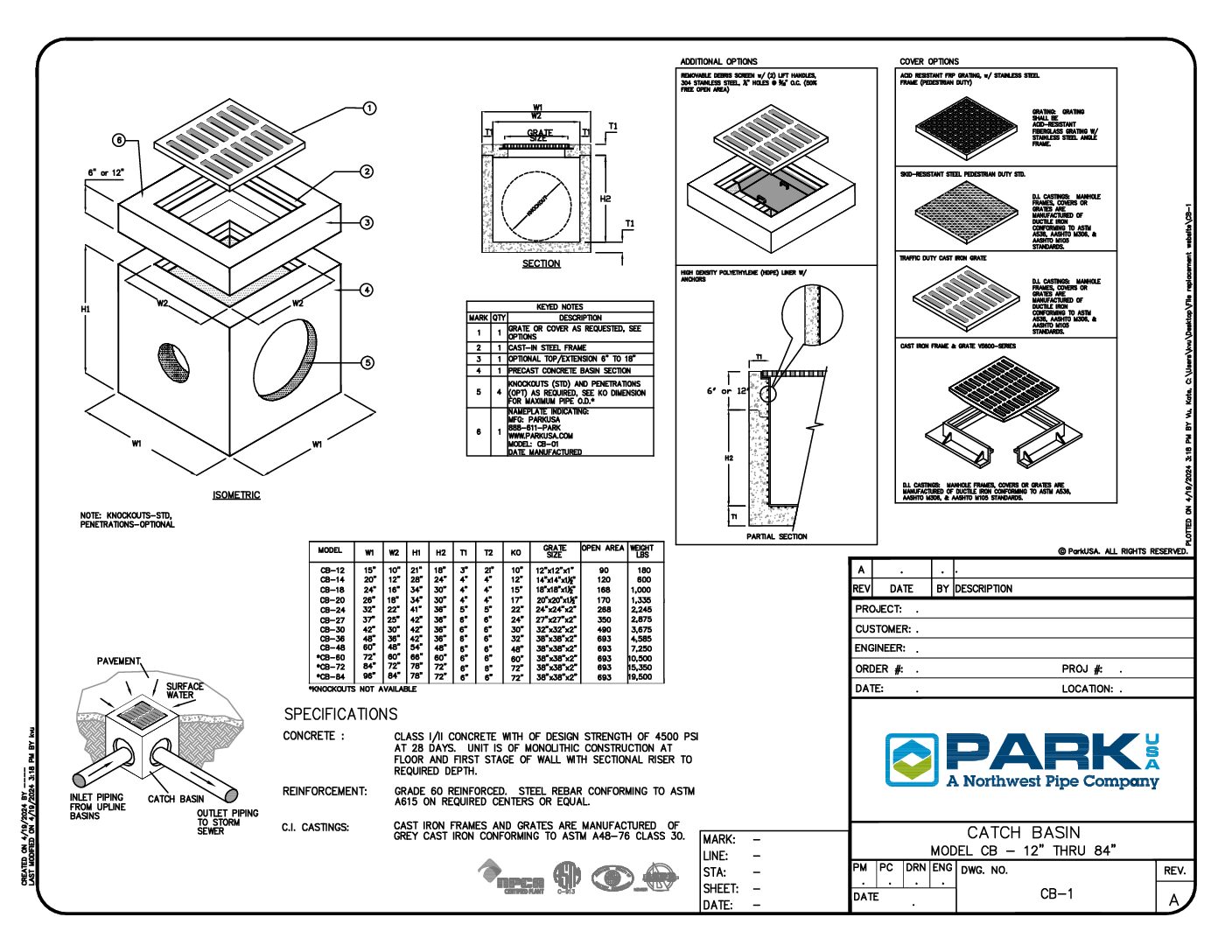 The NWPX Park Model CB catch basin is designed to collect and convey stormwater or runoff from paved areas such as parking lots, roads, and other hard surfaces. It is made of precast concrete and consists of a square or rectangular box with an open top, a cast-in steel frame, and a traffic-rated cast iron grate to allow stormwater runoff to enter while preventing coarse debris from entering the system. The perimeter walls contain thin-wall knockouts for connecting pipes for stormwater conveyance.
