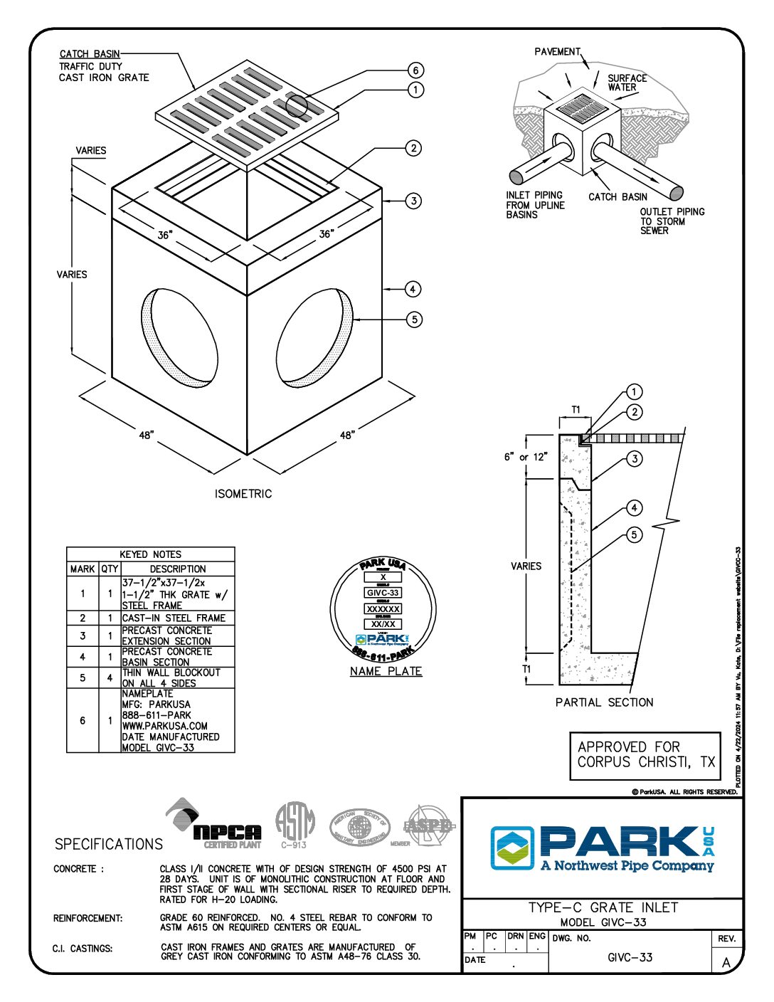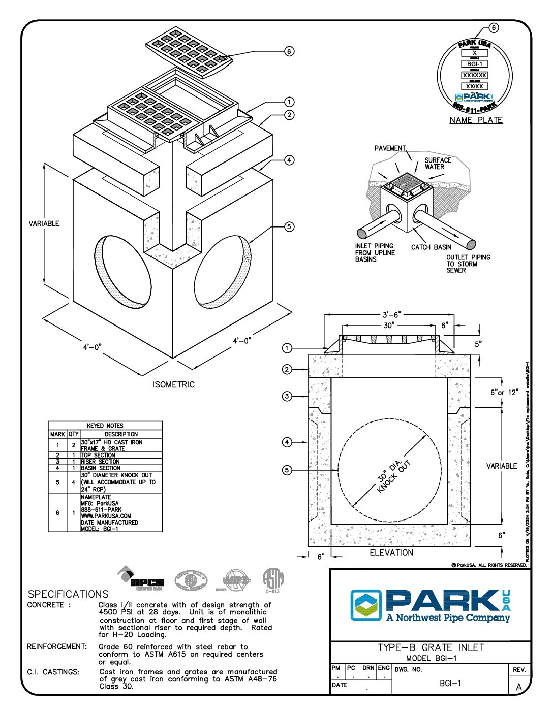 The inlet opening is covered with a grate or filter to prevent debris and other materials from entering the stormwater conveyance system. NWPX Park offers grate and cover options made of cast iron or ductile iron, including city logos, and various city and state models and sizes for quick shipment.