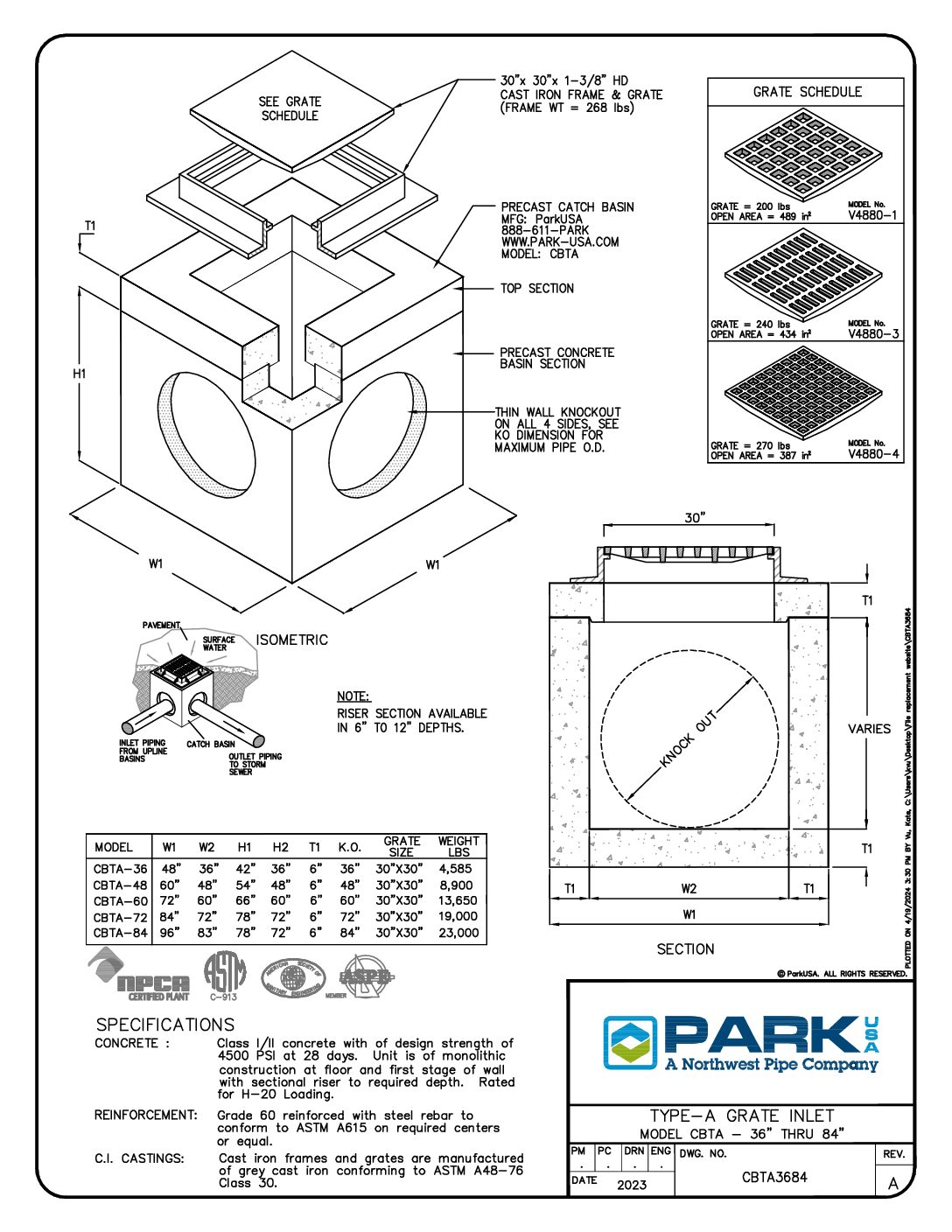 Model CBTA Inlet is made of precast concrete and consists of a square or rectangular box with an open top, a bottom flange iron frame, and a traffic-rated cast iron or ductile iron grate to allow stormwater runoff to enter while preventing coarse debris from entering the system. The perimeter walls contain thin-wall knockouts for connecting pipes for stormwater conveyance. The catch basin is available in different sizes and configurations to meet most application demands and municipal codes.