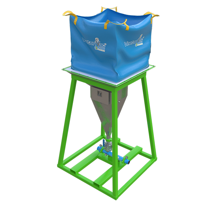 Our VenturiVac™ MaxSack Hopper model uses water as the motive force to unload the bulk bag and carry the material to the desired discharge point.