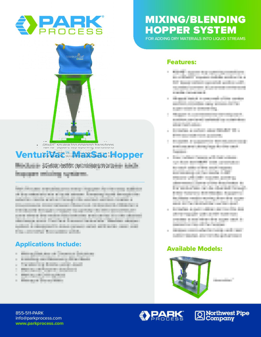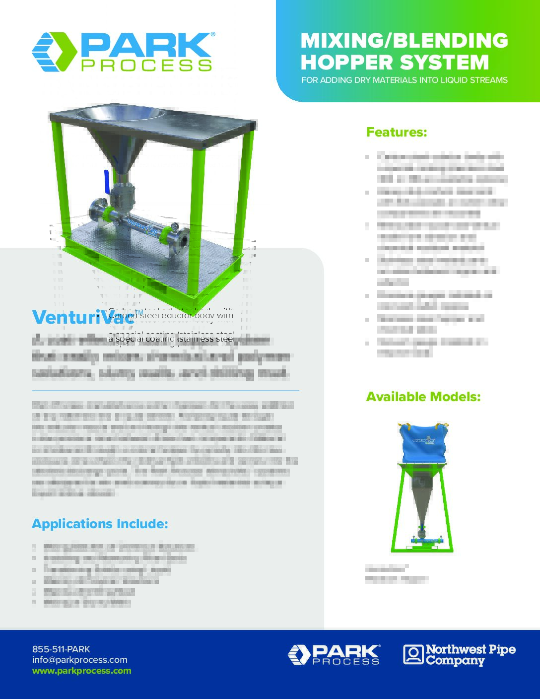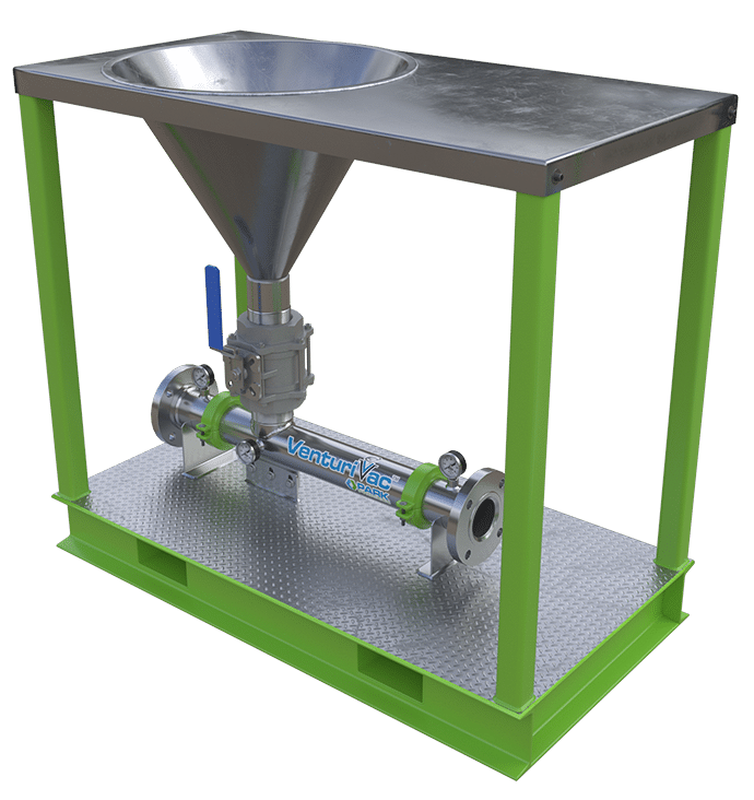 The Park Process VenturiVac™ Hopper Eductor System is designed for the easy addition of dry materials into a liquid stream. Pumping liquid through the VenturiVac™ eductor nozzle and on through the Venturi section creates a low-pressure zone between these two components. Material is introduced through a conical hopper by gravity into this low-pressure zone where the motive fluid entrains and carries it to the desired discharge point.