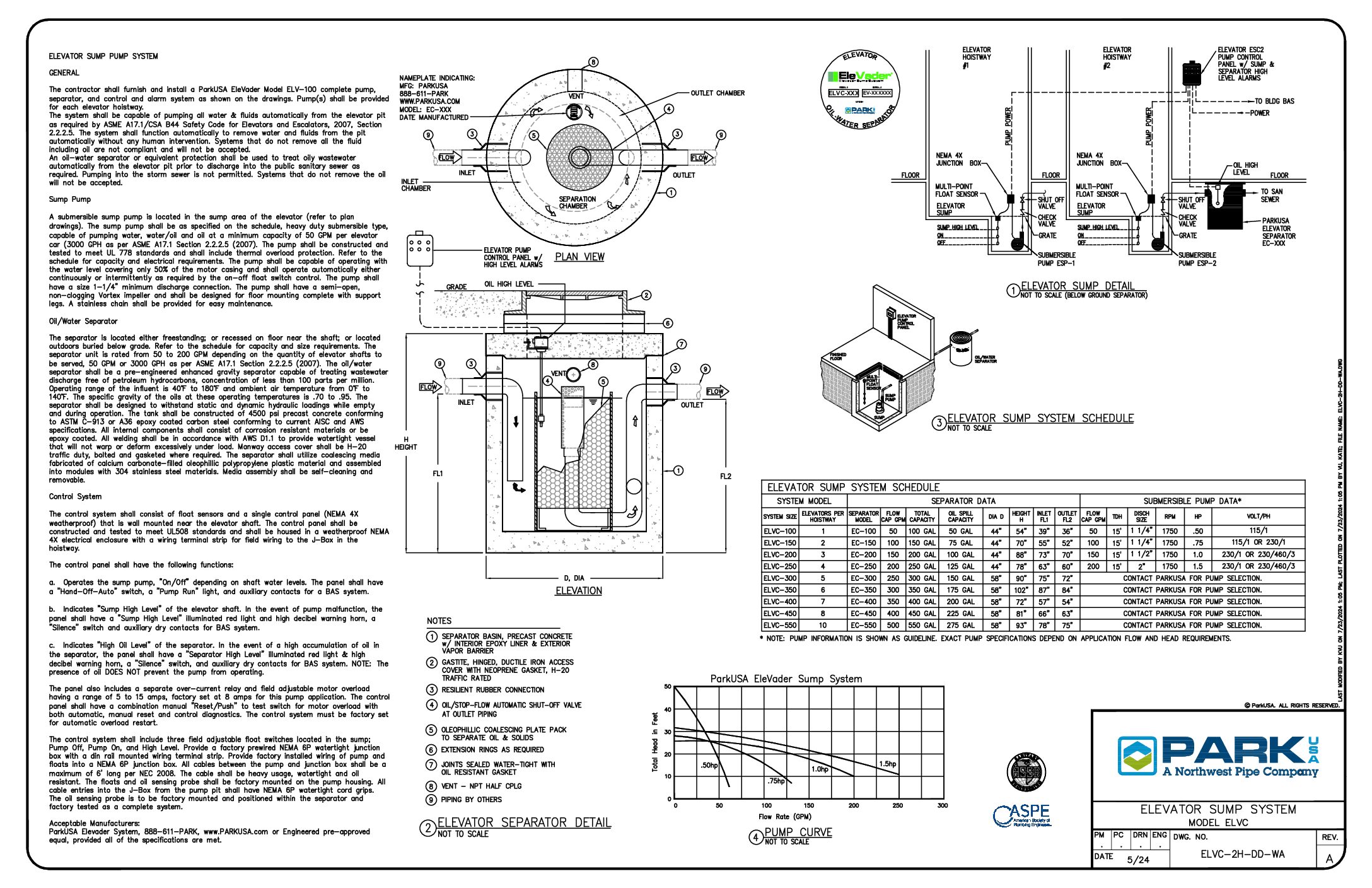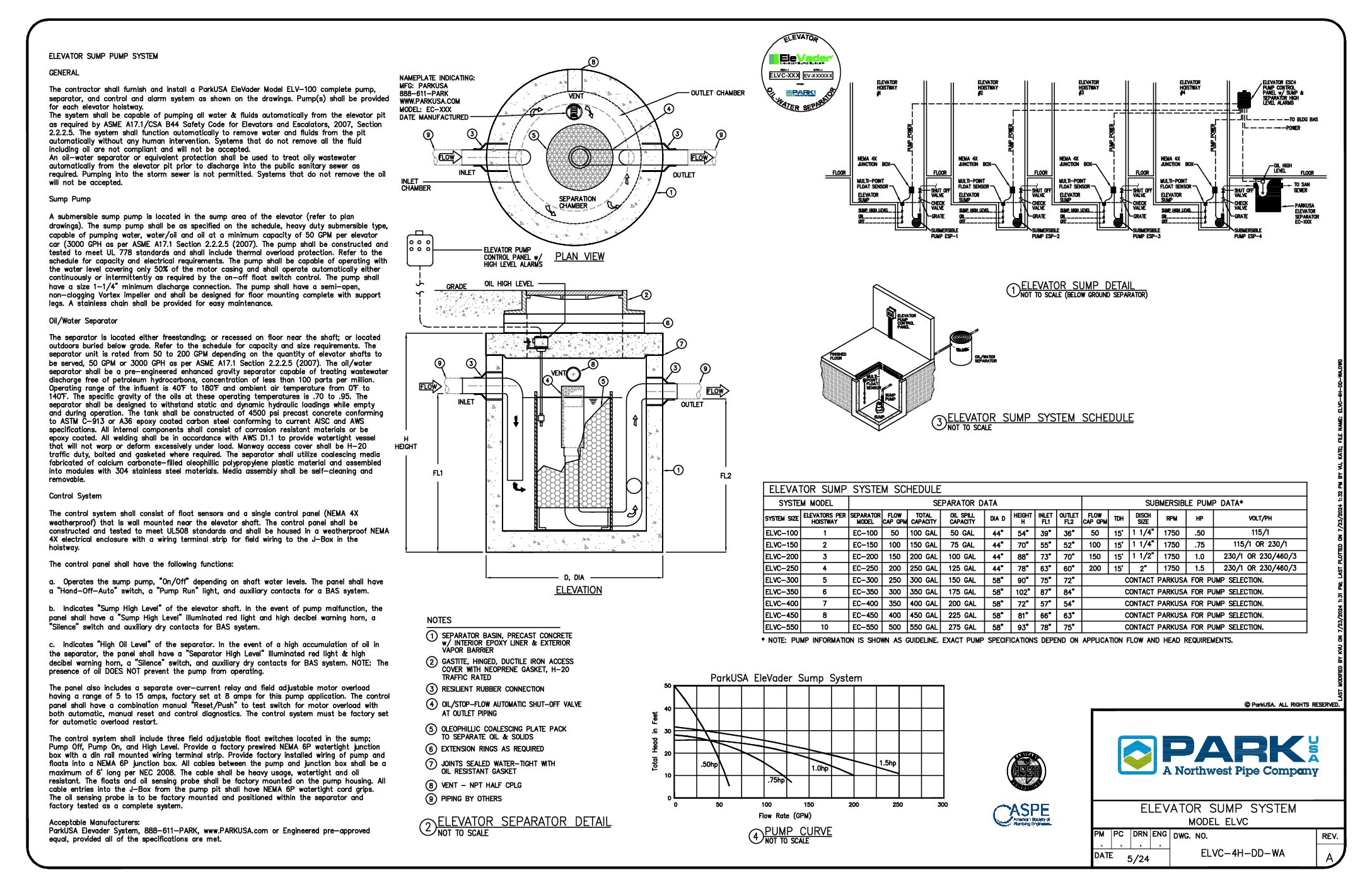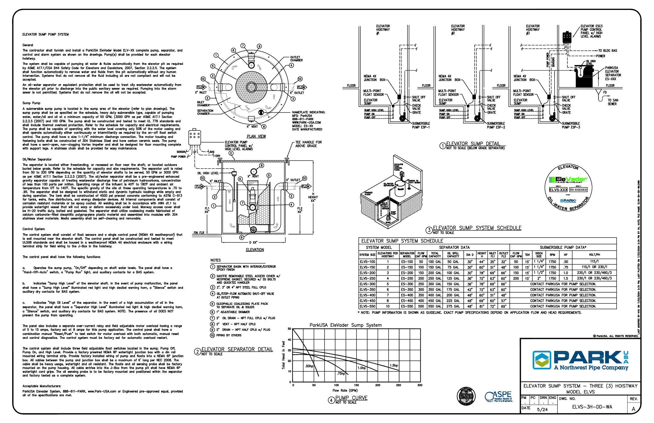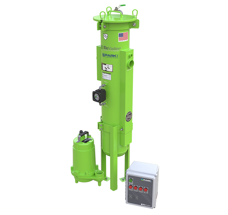 The EleVader system includes an automatic submersible pump, an oil-water separator with coalescing technology, an oil stop valve, and a control system that is compatible with the building automation system. It offers system configurations suitable for flow rates ranging from 50 to 400 GPM, depending on the number of elevator shafts that need to be serviced. The separator installation can be chosen for freestanding, direct burial, indoors, or outdoors. Additionally, the EleVader can be configured for a single elevator hoistway or multiple hoistways.