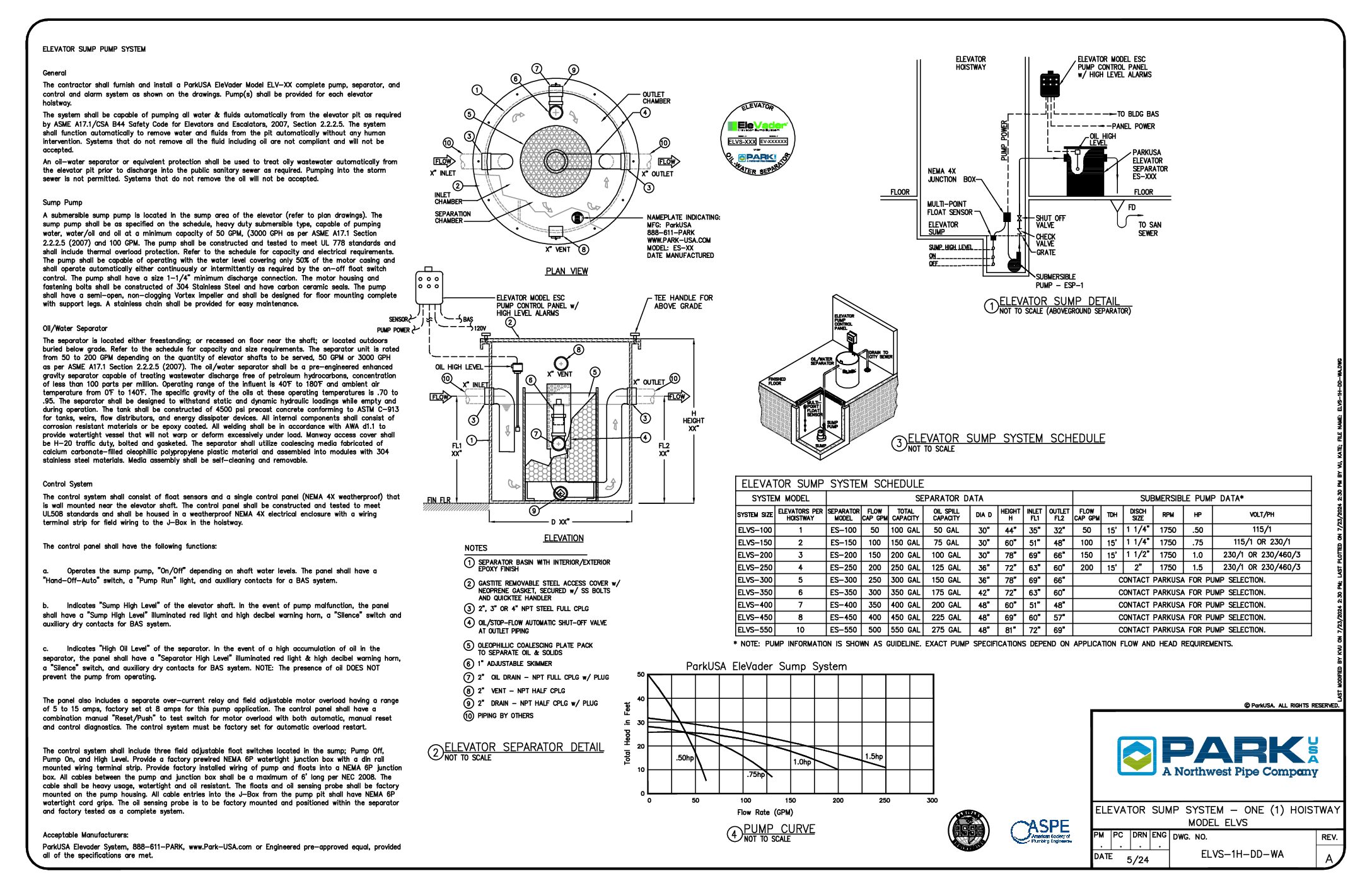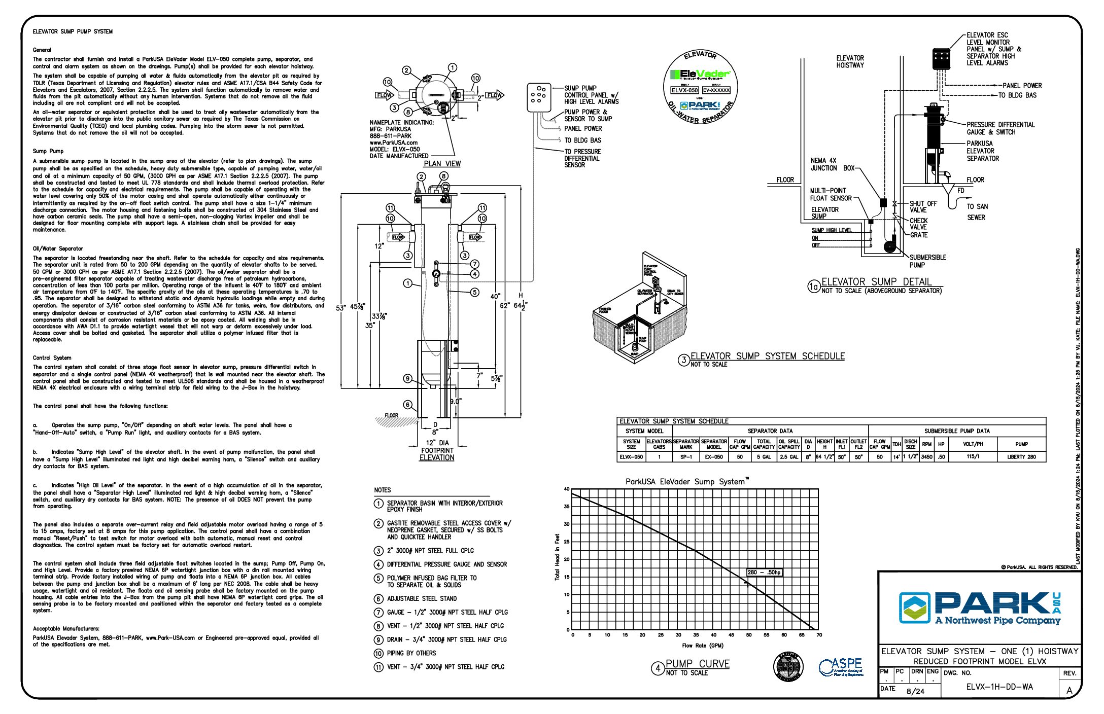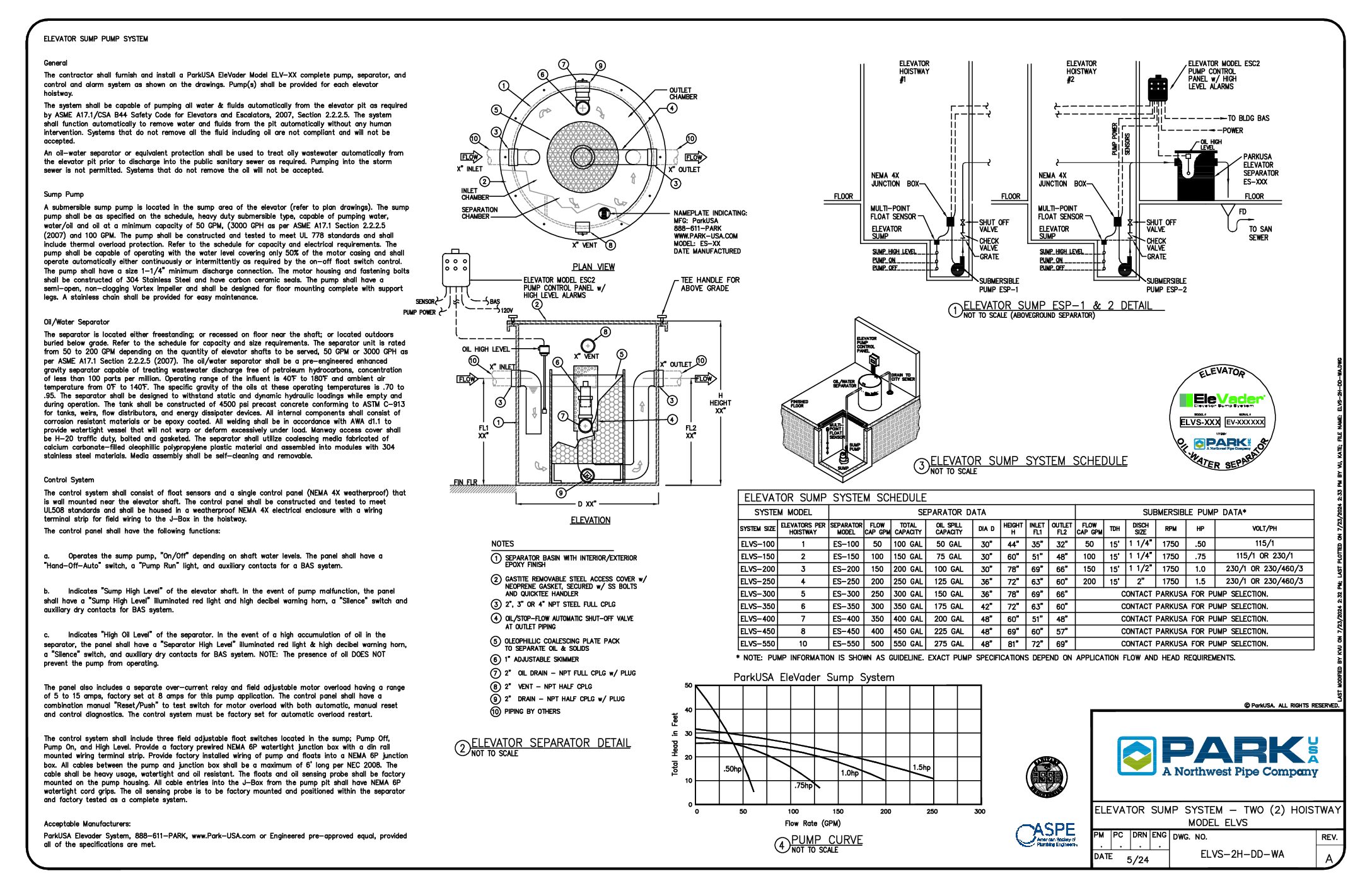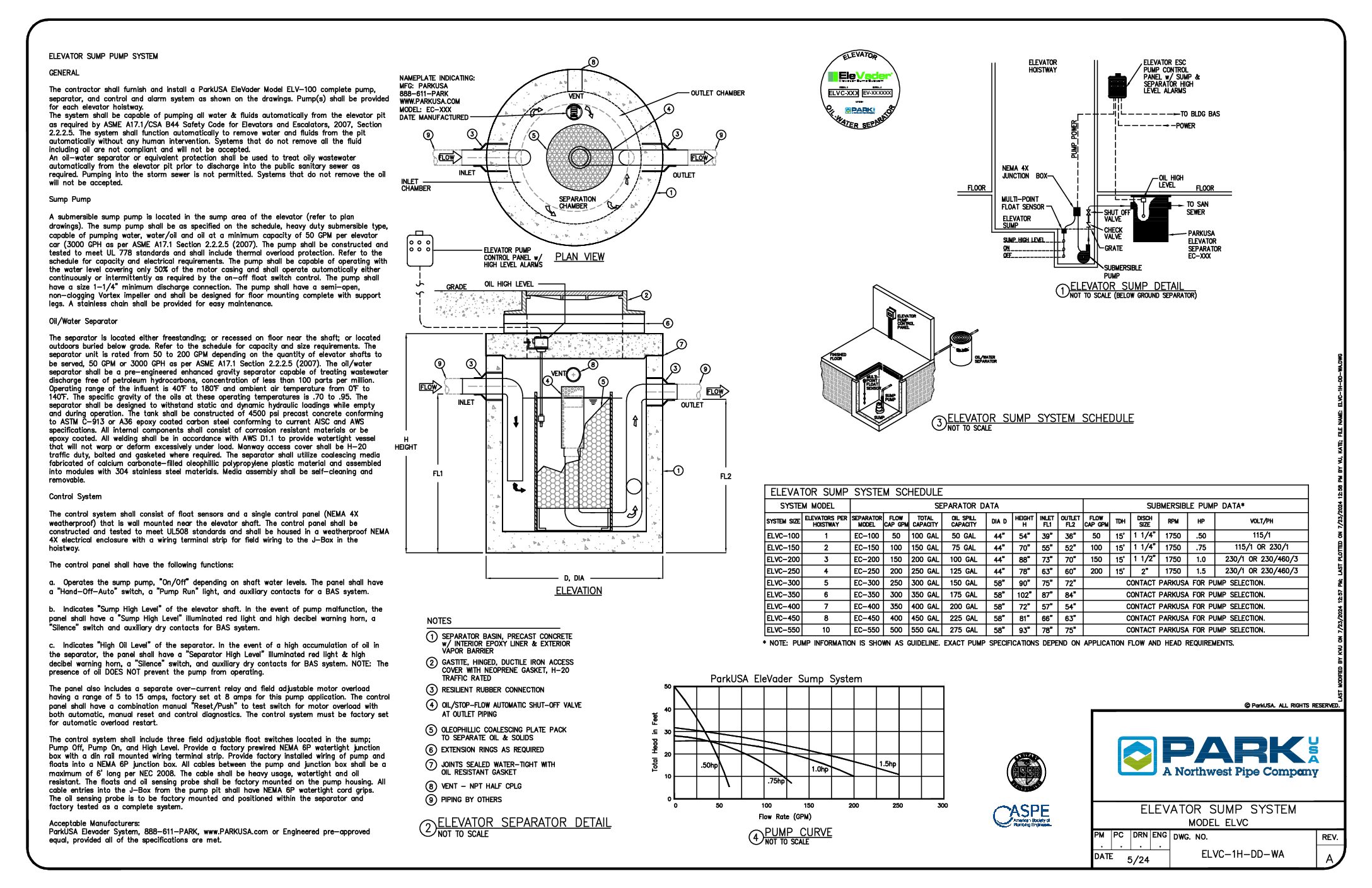 The EleVader system includes an automatic submersible pump, an oil-water separator with coalescing technology, an oil stop valve, and a control system that is compatible with the building automation system. It offers system configurations suitable for flow rates ranging from 50 to 400 GPM, depending on the number of elevator shafts that need to be serviced. The separator installation can be chosen for freestanding, direct burial, indoors, or outdoors. Additionally, the EleVader can be configured for a single elevator hoistway or multiple hoistways.