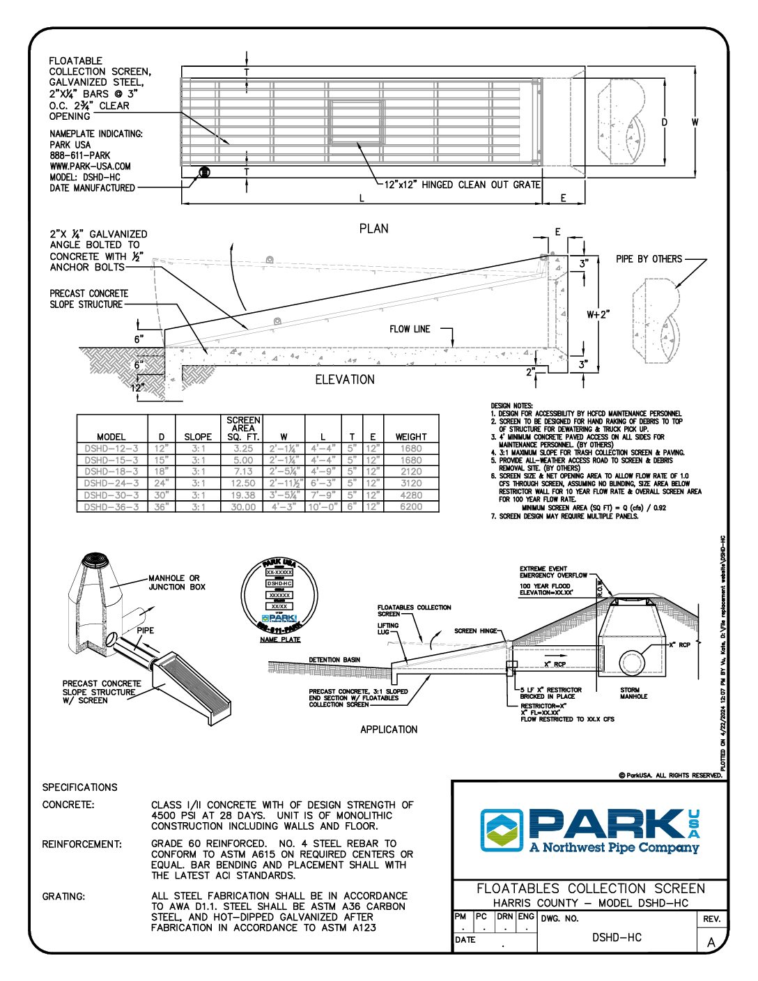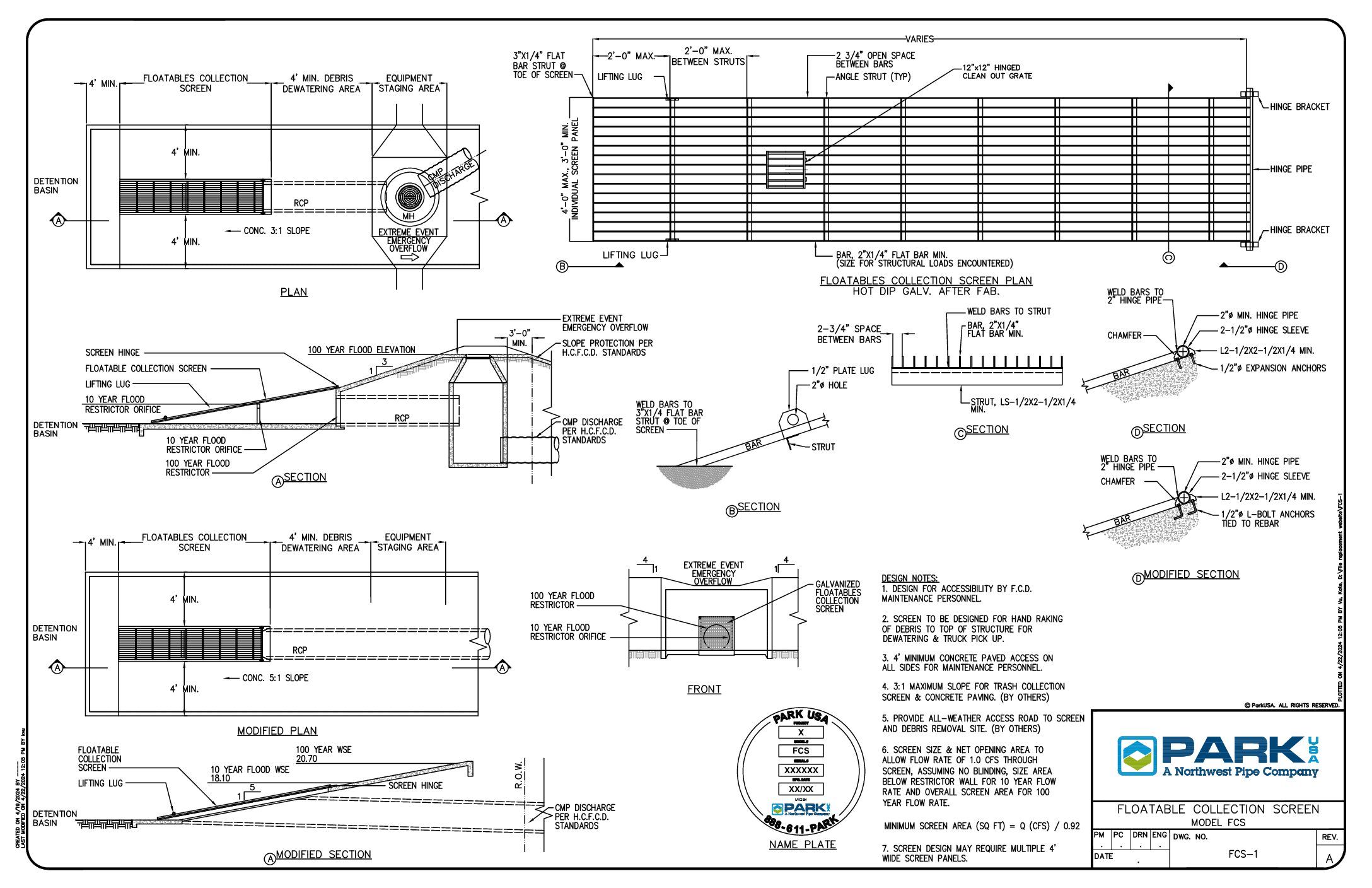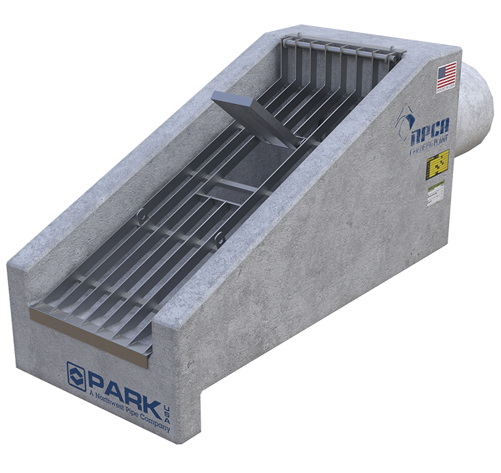 The NWPX Park Floatable Collection Screen efficiently removes trash and debris from stormwater runoff. The screen systems are comprised of two pieces, an intake screen structure, and an attached manhole that are placed in retention or detention pond berm. Water passes through an inclined screened intake and is discharged to the stormwater sewer system while the trash is retained in the detention pond.