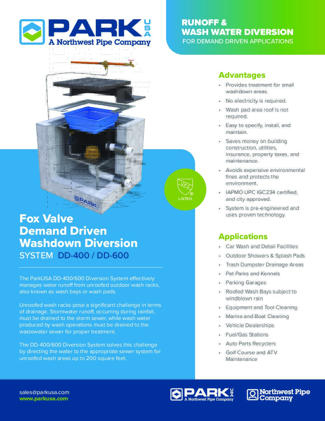 The Fox Valve Runoff and Washdown Diversion System collects and directs wastewater and stormwater to their respective sewer systems. The Demand Driven Washdown Diversion System (models DD-400 and DD-600) effectively manages water runoff from unroofed outdoor wash racks, also known as wash bays or wash pads. The DD-400/600 Diversion System solves this challenge by directing the water to the appropriate sewer system for unroofed wash areas up to 200 square feet.
