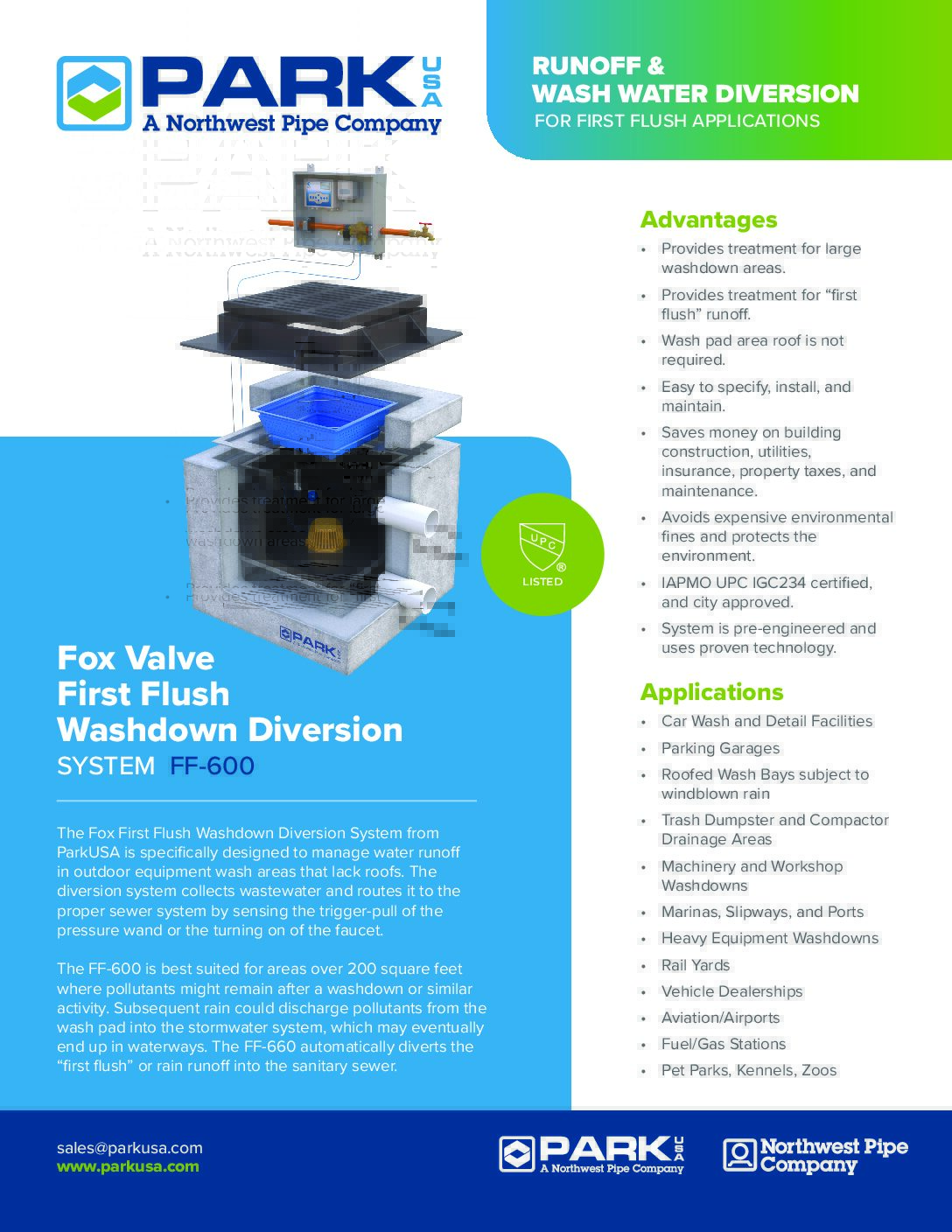 The Fox Valve First Flush Washdown Diversion Systems include a drain chamber with a surface grate inlet; two outlet pipes, one leading to the stormwater sewer system and one to the wastewater sanitary sewer outlet; and an automatic diversion valve located in the sanitary sewer outlet that is powered by water hydraulics. In the absence of washdown activity, runoff collected in the drain or catch basin during rainfall flows through the stormwater sewer outlet.