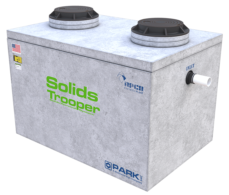 Solids interceptors, which are typically located outside and below grade, effectively remove solids from wastewater before it enters a sanitary sewer system. The interceptors are designed with multiple compartments that cause the water velocity to decrease significantly as the water enters the unit. As the water flows from one compartment to the other, solids in the wastewater will flocculate and either float to the surface or sink to the bottom.