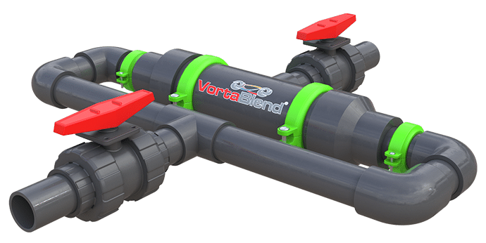 The VortaBlend™ Static Mixer has uniquely designed opposing nozzle plates that create opposite directional multiple spinning fluid “slabs” which collide in the center of the mixing chamber. The result is a thoroughly blended mixture of the main fluid with any other liquid chemical or chemical powder that has been introduced upstream. This mixing action can be accomplished with relatively low pressure drop across the VortaBlend™ device, with most applications requiring a 5-10 psi drop.