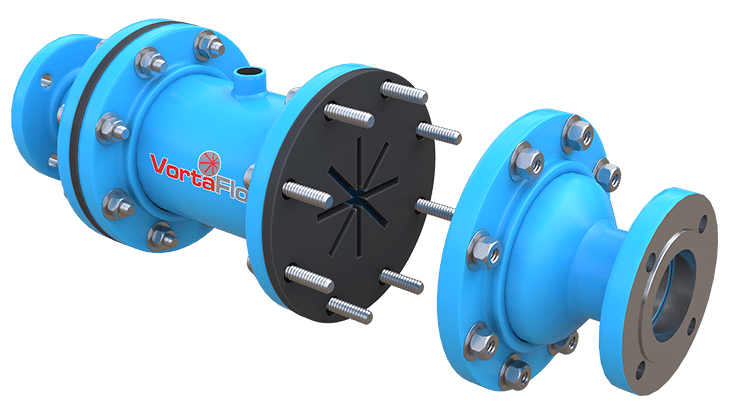 The VortaFlo™ can be installed in a pipeline and used simply as a static mixing device, or with the addition of an injection quill to the mixing body, chemicals such as polymers, acids, or caustics can be added and mixed into the fluid flow. It utilizes propriety nonmetallic mixing plates to accomplish the blending action.